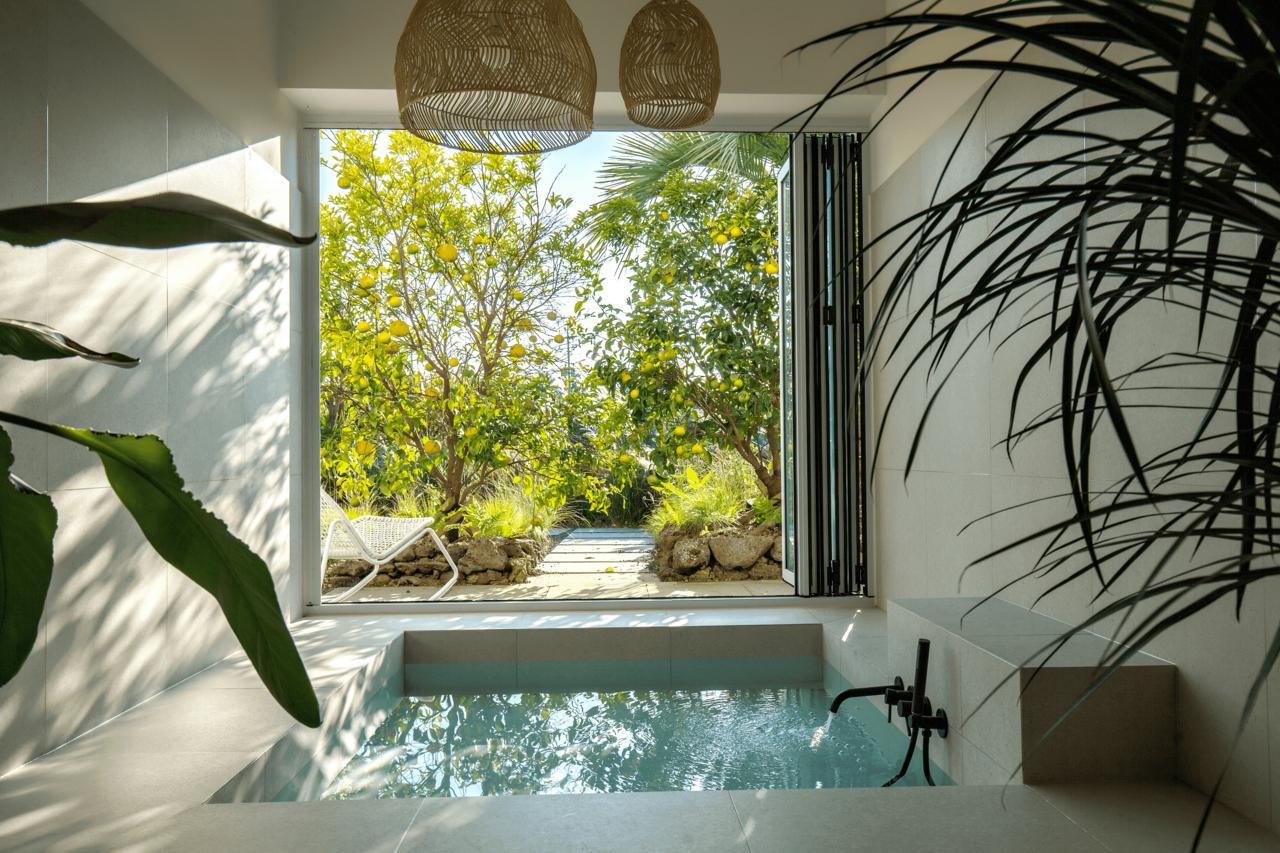실내와 외부가 이어져 있어 앞에 펼쳐진 자연의 숨결을 함께 느끼며 즐길 수 있는 대형 자쿠지입니다. 싱그러운 꽃향기와 바람의 속삭임 속에서, 따스한 물에 몸을 담그며, 자연의 품 안에서 휴식을 취하시길 바랍니다